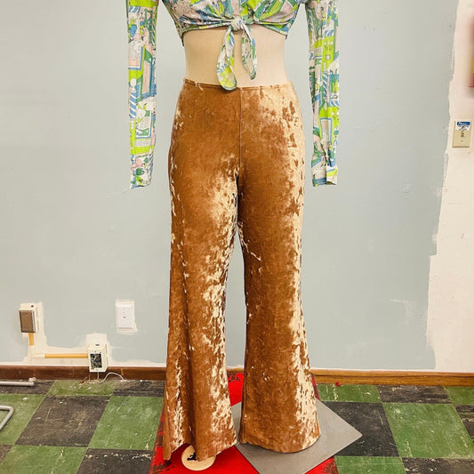 vtg 70s CRUSHED VELVET PANTS // vintage golden brown kick flare capri hippie boho autumn fashion earth tones bare back mid rise velour retro