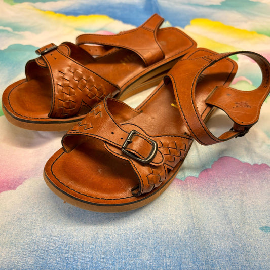 vtg 70s CUT OUT PLATFORM Sandals // vintage hippie retro wooden heels braided ankle straps girls womens size 5.5 cute boho open toe leather