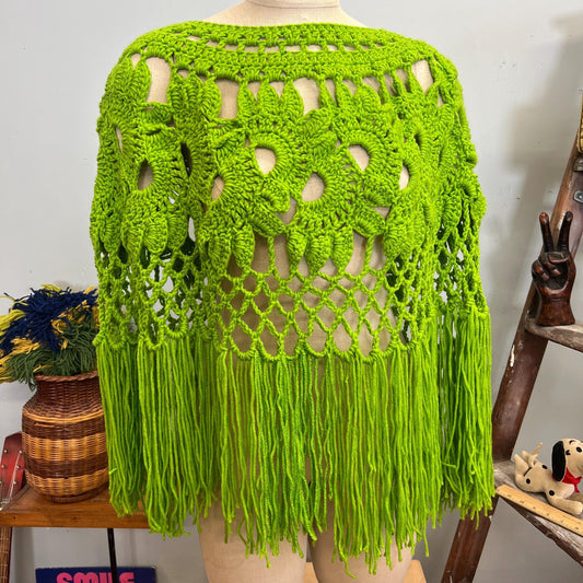 vtg 70s CROCHET FRINGE PONCHO // vintage neon chartreuse green long tassel colorful shawl autumn winter scarf cover up funky hippie style