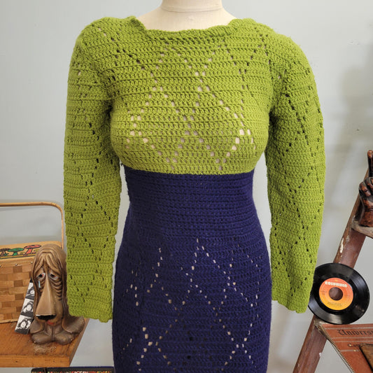 vtg 70s CROCHET KNIT DRESS / vintage two tone small womens fringe sweater retro funky dress handmade fitted wiggle autumn cottage cozy style