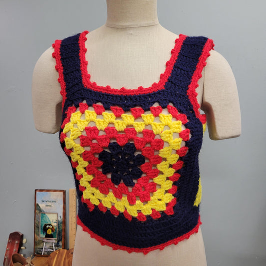 vtg 70s CROCHET TANK TOP // vintage knit granny squares womens small retro tank vest hippie boho cottage mod style primary colors handmade