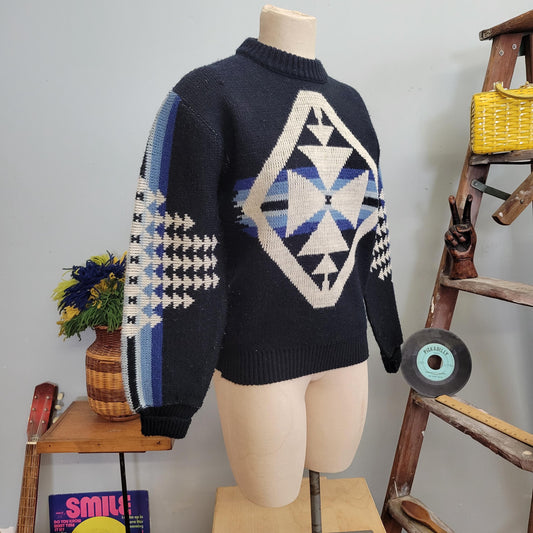 vtg 70s GEOMETRIC PATTERN SWEATER // vintage montgomery ward size medium Pendleton style navy blue triangles abstract multicolor striped