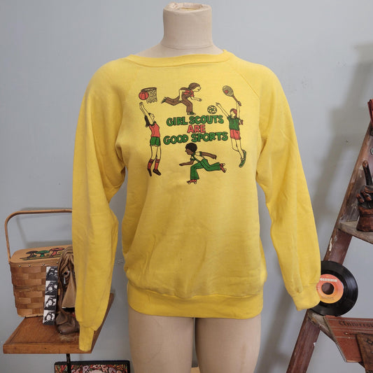 vtg 70s GIRL SCOUTS SWEATSHIRT // vintage crewneck medium womens good sports girl power autumn fall fashion pastel yellow retro colors shirt