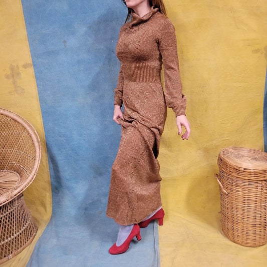 vtg 70s GOLD LUREX DRESS // vintage womens medium metallic knit sparkly glitter cowl neck roncelli style full length autumn cocktail party