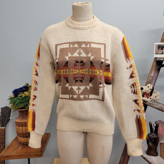 vtg 70s GEOMETRIC PATTERN SWEATER /vintage jcpenney medium mens warm tones sunset colors pendleton style southwestern autumn winter fashion
