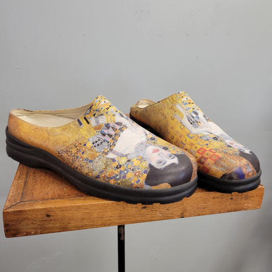 vtg 70s GUSTAV KLIMT ADELE Shoes // vintage size 7 womens usa classic art print wearable art slip on clogs cool retro chunky platforms