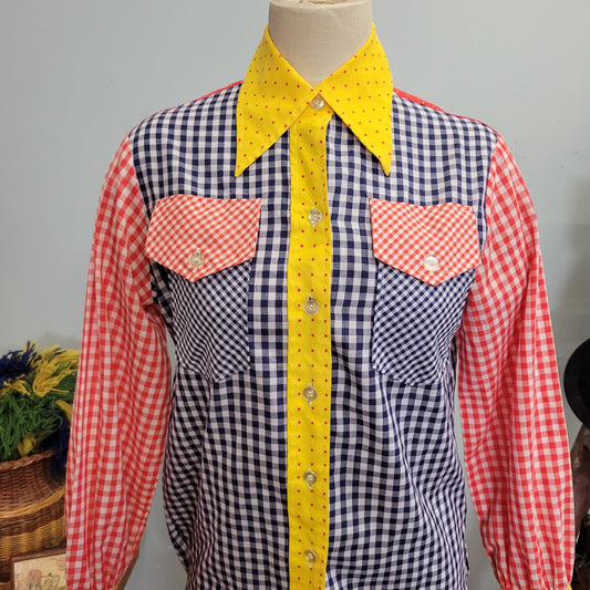 vtg 70s LADY WRANGLER SHIRT // vintage western top size 36 medium womens primary colors polka dot retro mod clown core hippie gingham plaid