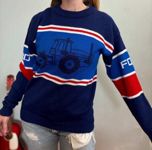 vtg 70s KNIT TRACTOR SWEATER // vintage blue striped primary colors ford company retro colors large oversized boxy color block novelty pop