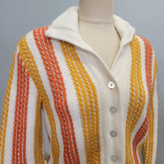 vtg 1950s ORANGE STRIPED CARDIGAN // vintage mcm rockabilly collared multicolor cable knit button up preppy rockabilly style acrylic bowling