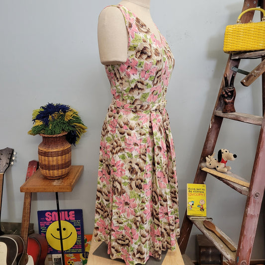 vtg 1950s FLORAL SEQUIN DRESS // vintage womens small watercolor flowers abstract monet style belted fit n flare Betty Draper cottage core