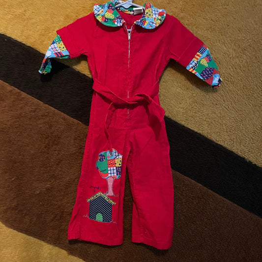 vtg 70s PATCHWORK JUMPSUIT // vintage size 2T red corduroy bell bottom pantsuit americana hippie retro mod cute toddler outfit mcm onesie