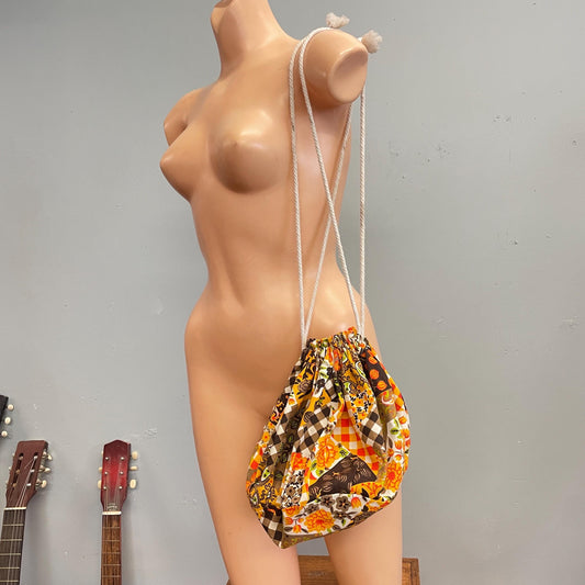 vtg 70s PATCHWORK SLOUCHY PURSE // vintage cute earth tones floral tote cinchy hippie mod kitschy holly hobbie autumn fashion accessories