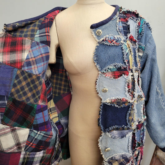 vtg 70s PATCHWORK DENIM JACKET // vintage handmade flannel lined jean jacket folk art funky crafty granny suares afghan blanket tapestry