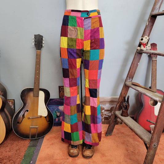 vtg 70s PATCHWORK BELL BOTTOMS // vintage midwest trading indian cotton womens 26/27 brightly colored high waisted hippie autumn boho pants