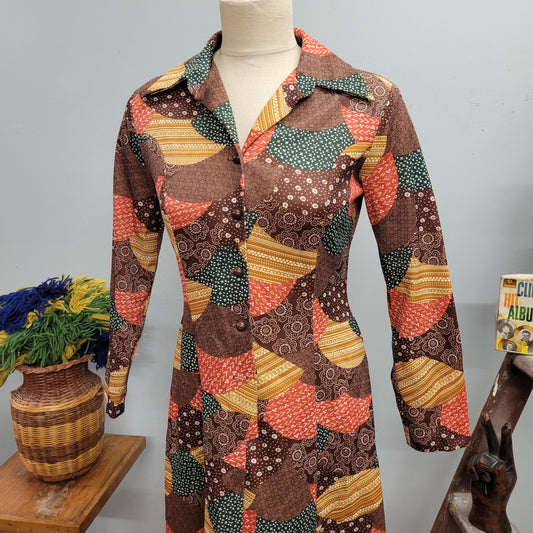 vtg 70s PATCHWORK DRESS // vintage autumn fall fashion sears womens medium floral bandana abstract patterned collared mod hippie brady bunch