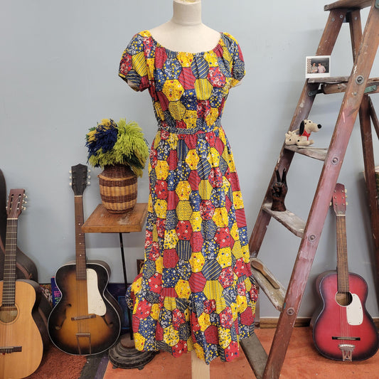 vtg 70s PATCHWORK COTTAGE DRESS // vintage belted womens large scoop neck hippie americana boho folk art puffed sleeve maxi bandana pattern