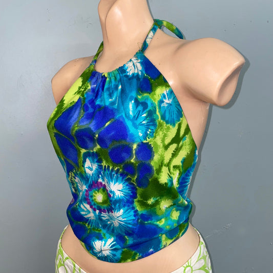 vtg 70s psychedelic tie dye halter top floral neon hawaiian barkcloth crop top retro summer beachwear hippie boho wrap top swim cover up top