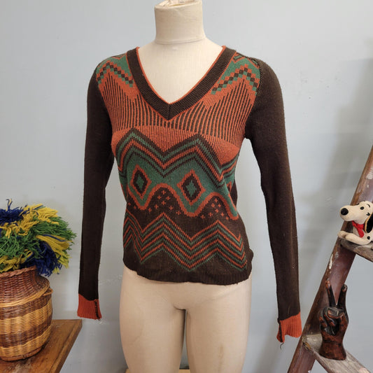 vtg 70s PSYCHEDELIC SWEATER // vintage medium womens v neck abstract geometric retro autumn vibes warth tones multicolor cute fit winter top