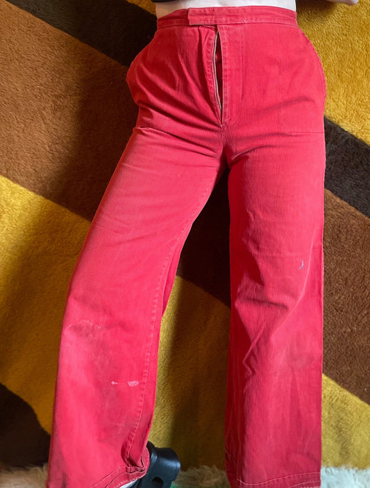 vtg 70s RED CORDUROY FLARES // wide leg pants high waisted bellbottom trousers preppy hippie *as is *needs zipper on track cute casual boho