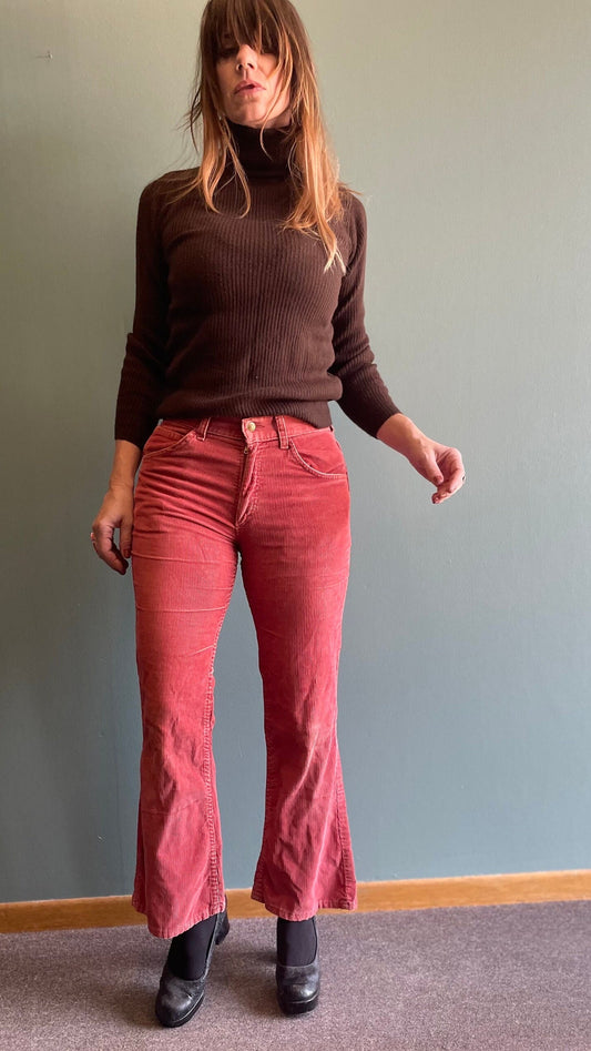 vtg 70s RED CORDUROY PANTS // vintage 27 x 29 mid rise faded distressed flare jeans cords unisex kick flares autumn colors campus hippie