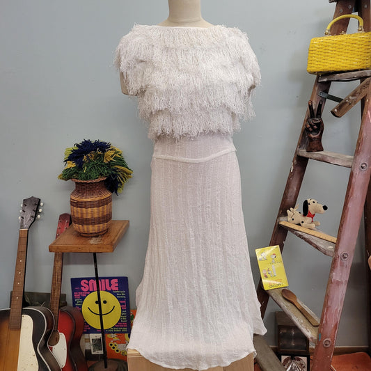 vtg 70s SHAGGY KNIT DRESS // vintage miss ashlee california size 9/10 rayon shaggy white fringe fancy couture style art deco evening dress