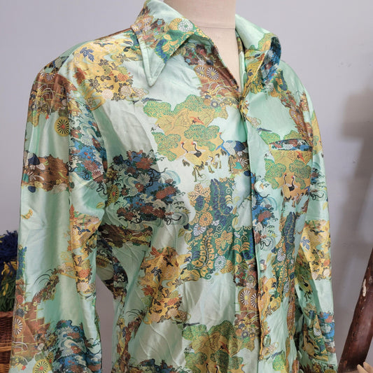 vtg 70s SILKY PATTERN TOP // vintage waltch clarkes psychedelic Asian bird peacock print disco retro polyester patterned blouse autumn top