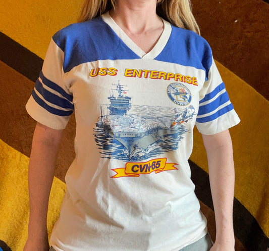 vtg 70s TOP GUN USS // vintage enterprise cvn 65 navy aircraft carrier striped ringer shirt 80s retro graphic tee striped sleeves v neck