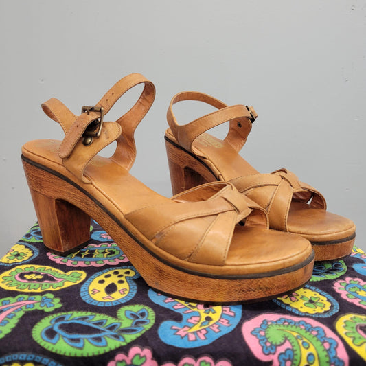 vtg 70s WOOD PLATFORM HEELS // vintage tan leather strappy chunky platforms disco hippie mod open toe sandals minimalist retro stacked pumps
