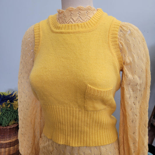 vtg 70s YELLOW SWEATER SET // vintage medium puffed sleeve sheer knit sweater & optional yellow sweater vest for layering pastel sunny fall