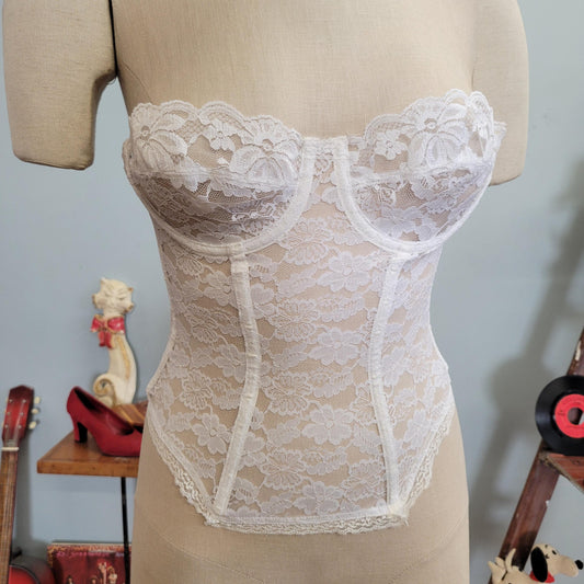 vtg 70s WHITE LACE TEDDY // vintage boned bustier corset bra 32B union lingerie dolores for poirette figure forming push up strapless sexy