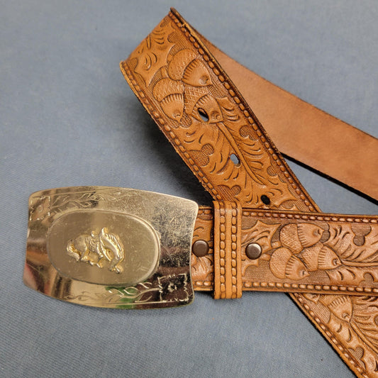 vtg 70s WESTERN LEATHER BELT // vintage size 32 hereford full grain cowhide hand tooled tan floral leather belt with silver bronco buckle