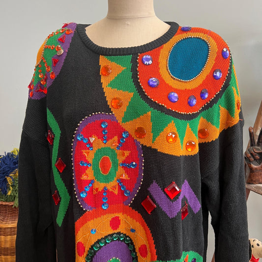 vtg 80s BEDAZZLED JEWEL SWEATER // vintage jacque & koko 3xl jewel tones oversized long abstract pattern sweater dress blingy festive op art