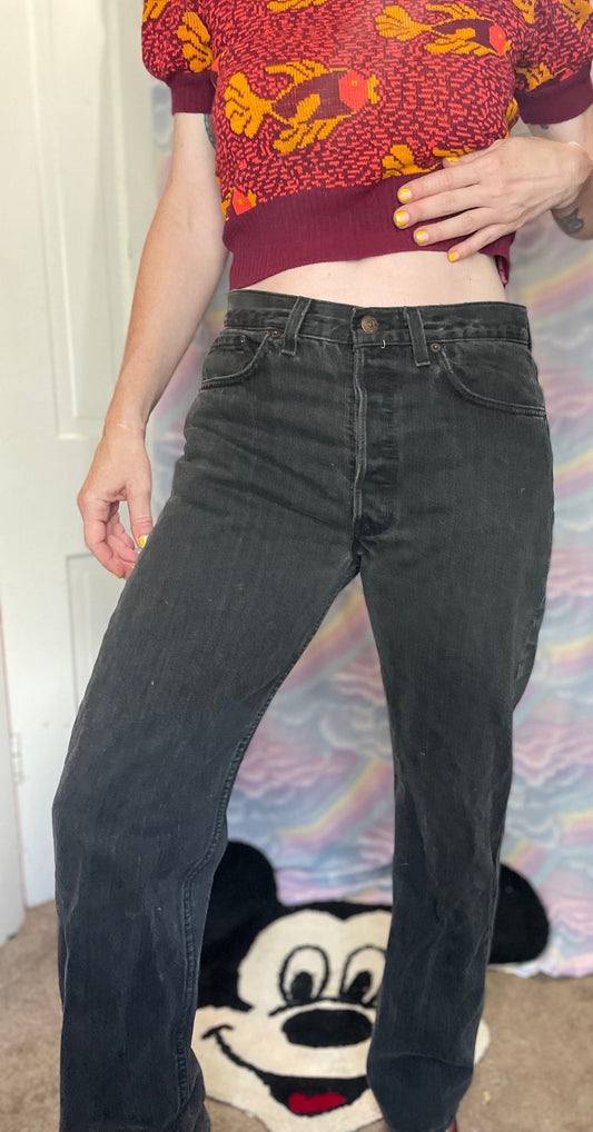 vtg 80s BLACK LEVIS 501 Button Fly Jeans // vintage red tab dark wash denim punk industrial mysterious classic fit 90s gray faded tapered 32
