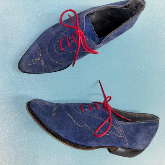 vtg 80s BLUE SUEDE BOOTIES // vintage embroidered pointy toe indigo shoes with red contrasting laces colorful rainbow embroidery mod western