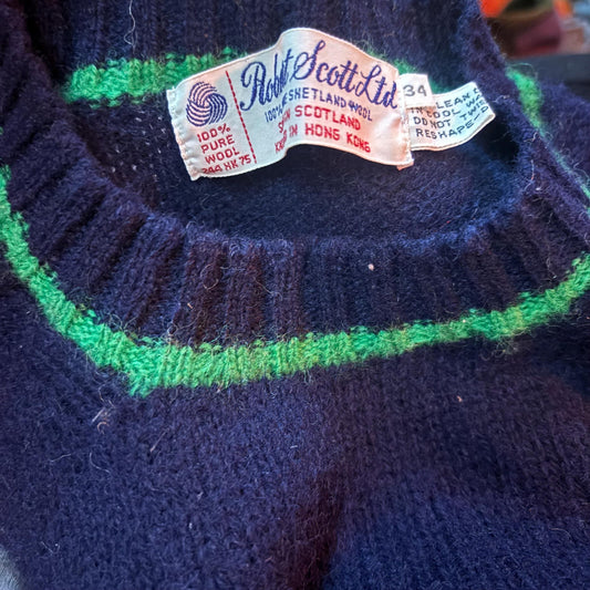 vtg 80s BLUE & GREEN SWEATER // vintage Robert Scott shetland wool striped fuzzy fitted cropped sweater solid colors navy blue cozy knit