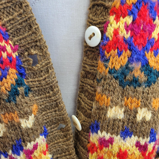 vtg 80s BRIGHT PATTERN CARDIGAN // vintage roberta freymann medium wool sweater rainbow multicolor v neck thick chunky oversized funky style