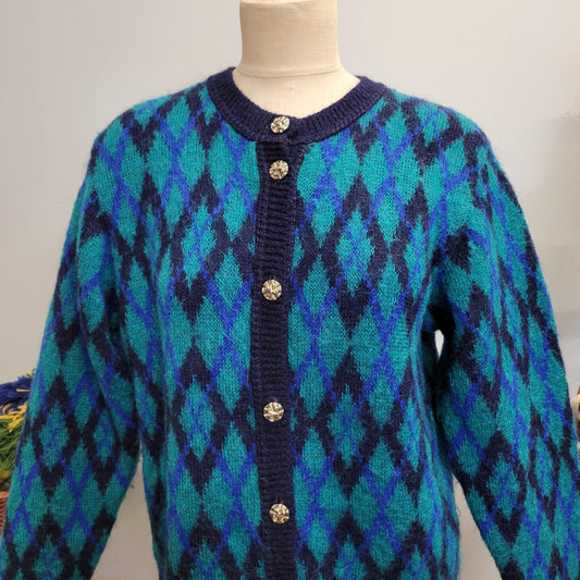 vtg 80s BLUE MOHAIR CARDIGAN // vintage edinburgh medium fuzzy argyle button sweater psychedelic stained glass style diamond check patterned