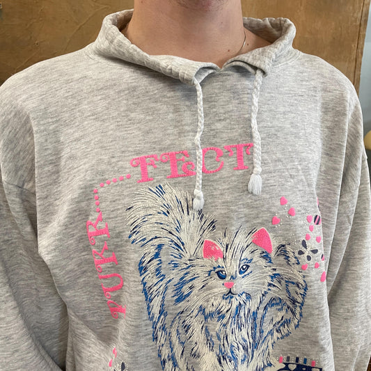 vtg 80s CAT SWEATSHIRT // vintage sweater cute boxy fit kitty heather grey drawstring collar kitten fur babies mother dad ironic retro shirt