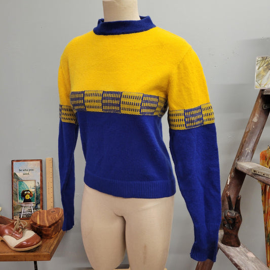 vtg 80s BUILDINGS PATTERN SWEATER // vintage genuine kandel 38 acrylic two tone abstract city skyline embroidered varsity cheerleader style