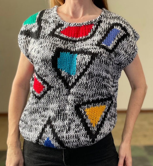 vtg 80s BRIGHT SWEATER VEST // vintage hand knit womens large acrylic pullover multicolor geometric triangles pattern space dye boxy top