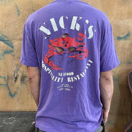 vtg 80s CRAB DISTRESSED TSHIRT // vintage pocket tee purple hanes square tourist pub bar restraunt eatery nicks holes fade color retro tee