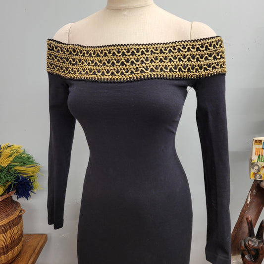 vtg 80s CONTEMPO CASUALS DRESS // vintage gold black contempo casuals medium womens off the shoulder sexy gold embroidered wiggle cocktail