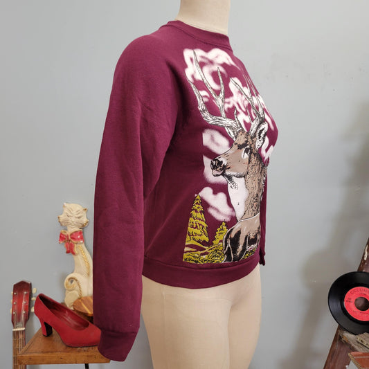 vtg 80s DEER CREWNECK SWEATSHIRT // vintage tultex youth large 14/16 womens petite burgundy all over print buck deer hunter kids fall style