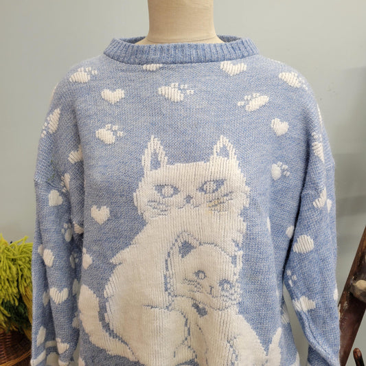 vtg 80s CUTE CAT SWEATER // vintage new addition xl womens pastel lavender kitty paws hearts all over print knit autumn winter style fashion