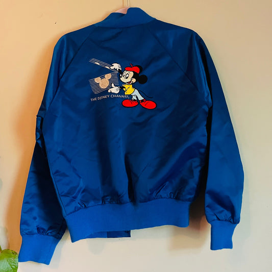 vtg 80s DISNEY CHANNEL BOMBER // vintage mickey mouse the cloth tattoo womens small retro tv show cute cropped blue satin bomber jacket