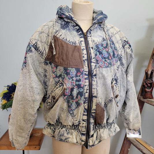 vtg 80s DENIM PATCHWORK JACKET // vintage weathered blues size large acid wash floral patterned oversized jean jacket funky puffer style