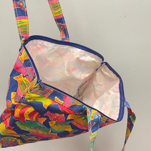 vtg 80s FISH TOTE BAG // vintage oversized maximalist neon colorful beach vacation carry all overnight aquatic pattern messenger make up bag