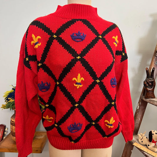 vtg 80s FLEUR DE LIS Sweater // vintage red criss cross large american weekend ribbed cotton chunky knit mock neck autumn slouchy bright top