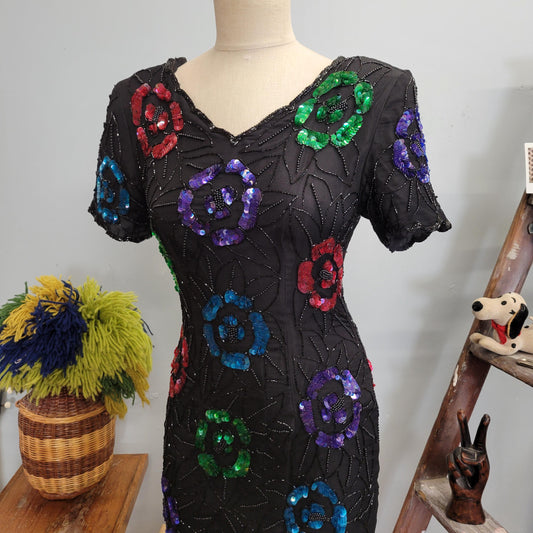 vtg 80s FLOWER SEQUIN DRESS // vintage styleworks size 10 womens medium holiday new years sparkly cocktail beaded party gown rainbow pattern