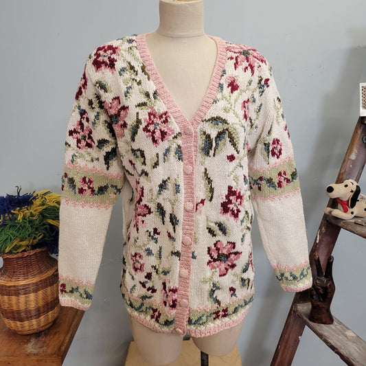 vtg 80s FLORAL EMBROIDERED CARDIGAN // vintage knit sweater dbl small womens oversized tapestry thick chubby knit cottage button up sweater